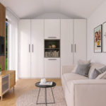Dispozice pokojů: Montovaný dům nabízí kombinovaný obývací pokoj s kuchyní a koupelnou.