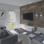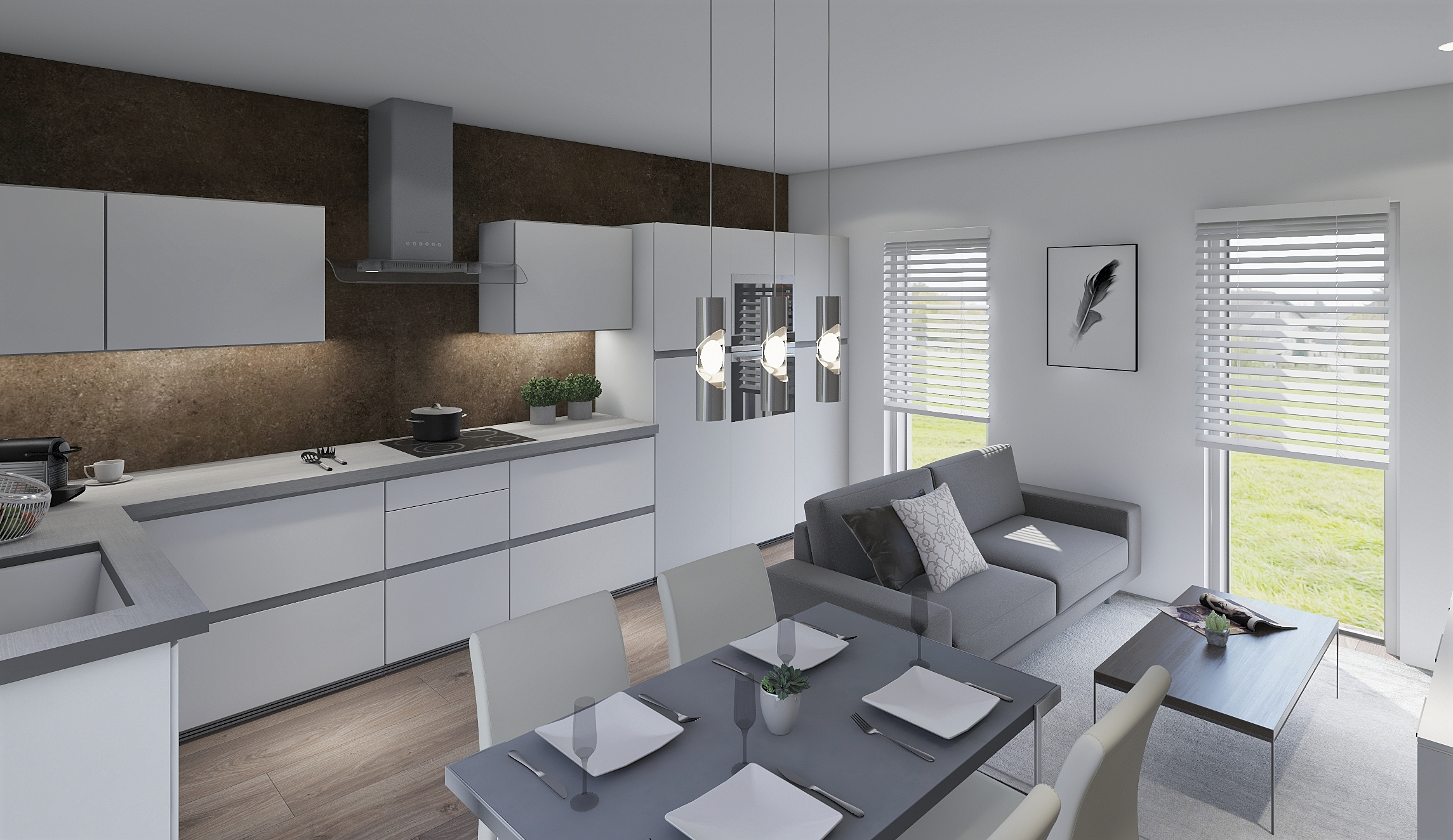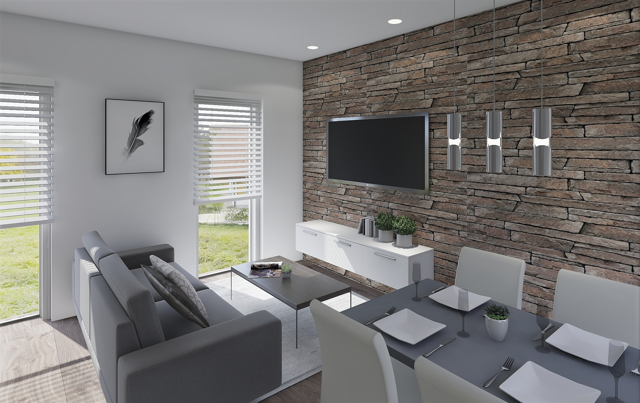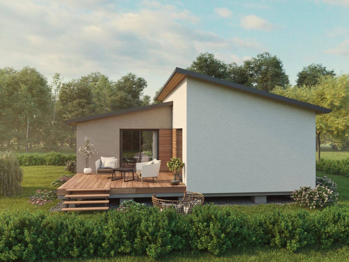 Das Holzhaus Easy 72 vereint unsere beiden grundlegenden Bautypen – den Modulbau, indem es teilweise ein L mit einem Winkel und der Terrasse bildet, jedoch zugleich auch die klassische rechteckige Form der Häuser, sodass es kompakter als die längeren, schmaleren Modelle wirkt. Das interessante Design wird durch die Pultdächer der Module abgerundet.