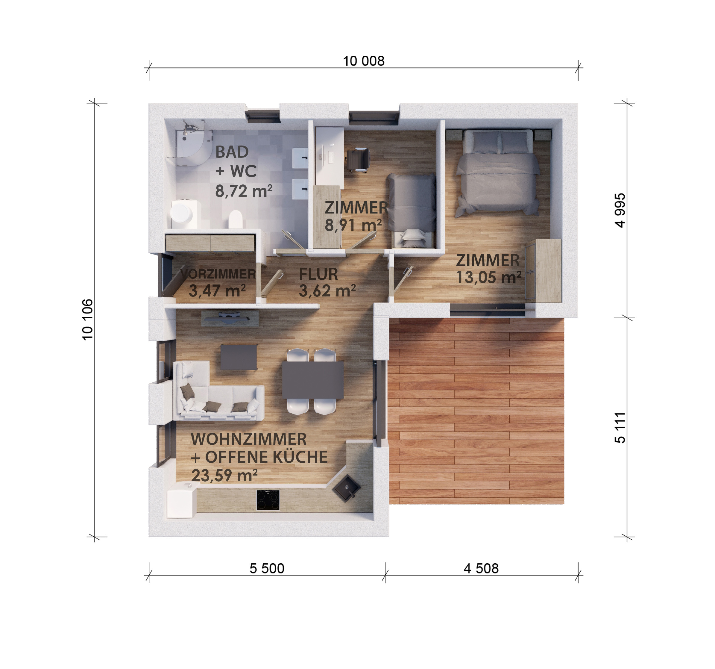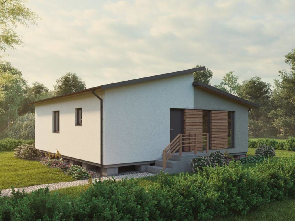 Dieses Holzhaus kann nicht transportiert werden und wird daher auf dem Grundstück des Bauherrn errichtet. Wir empfehlen es für 2-3 Personen. Durch eine Abänderung der Grundrisse kann eine Garderobe, ein Technikraum z.B. zu Lasten des Zimmers und durch Verkleinerung des Bades geschaffen werden.