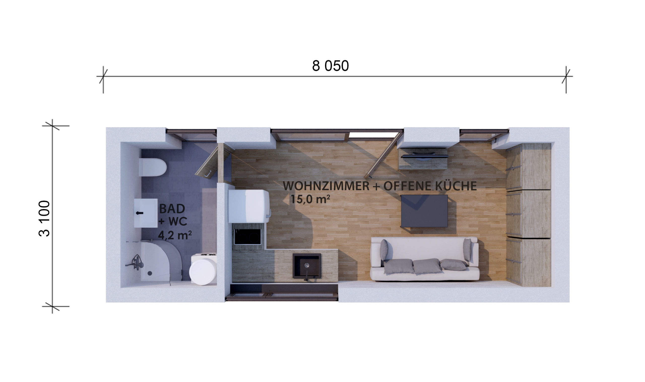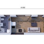 Unser kleinstes Fertighaus mit einer Größe von 8×3 Meter eignet sich für Personen, die nicht viel Platz brauchen und auf der Suche nach einem leistbaren und dennoch vollwertigen Haus sind. Dieses kompakte Fertighaus ist für 1-2 Personen geeignet und wird am häufigsten als Ferienhaus zur Vermietung oder als Arbeiterquartier bestellt.