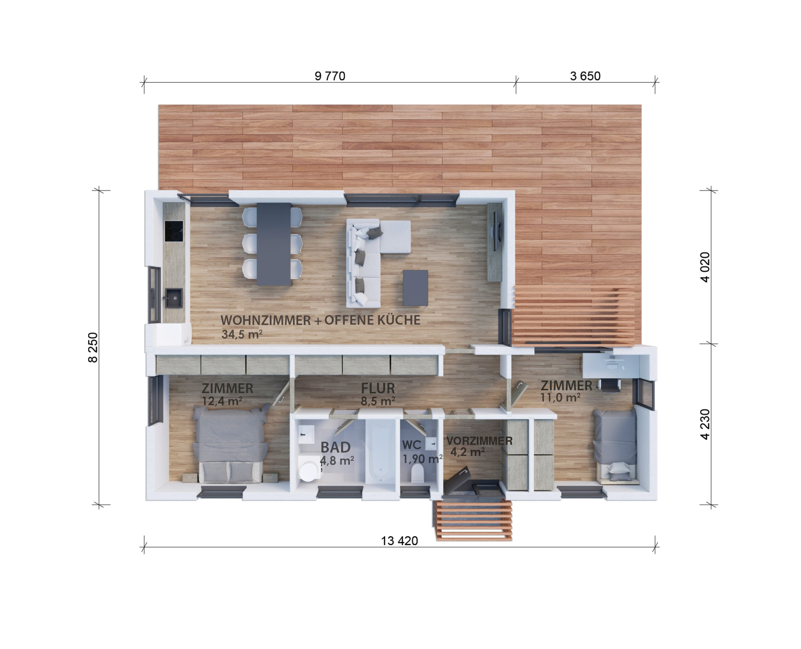 Raumaufteilung: Das Holzhaus hat ein Erdgeschoss mit 3 Zimmer mit Küche – Eingang mit Windfang und Flur, Wohnzimmer mit Kochnische, Bad, WC, Zimmer und Schlafzimmer.