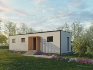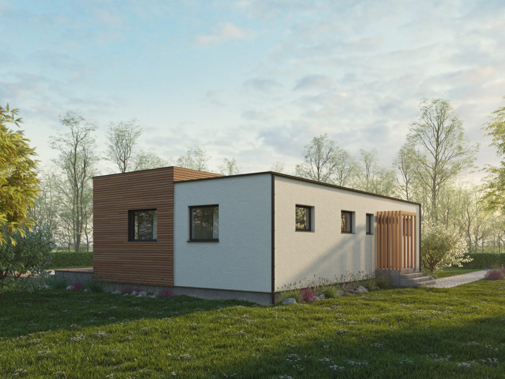 Ein geräumiges Holzhaus Easy 89, errichtet vor Ort auf dem Grundstück des Kunden. Die Hauptvorteile sind geringe Anschaffungskosten und die schnelle Realisierung. Die Grundrissgestaltung des Hauses mit 2 Zimmern mit großzügiger Wohnküche bietet einer Familie vollwertiges Wohnen, wobei durch die Verkleinerung des Wohnküchenbereichs auf Wunsch ein weiteres Zimmer geschaffen werden kann.