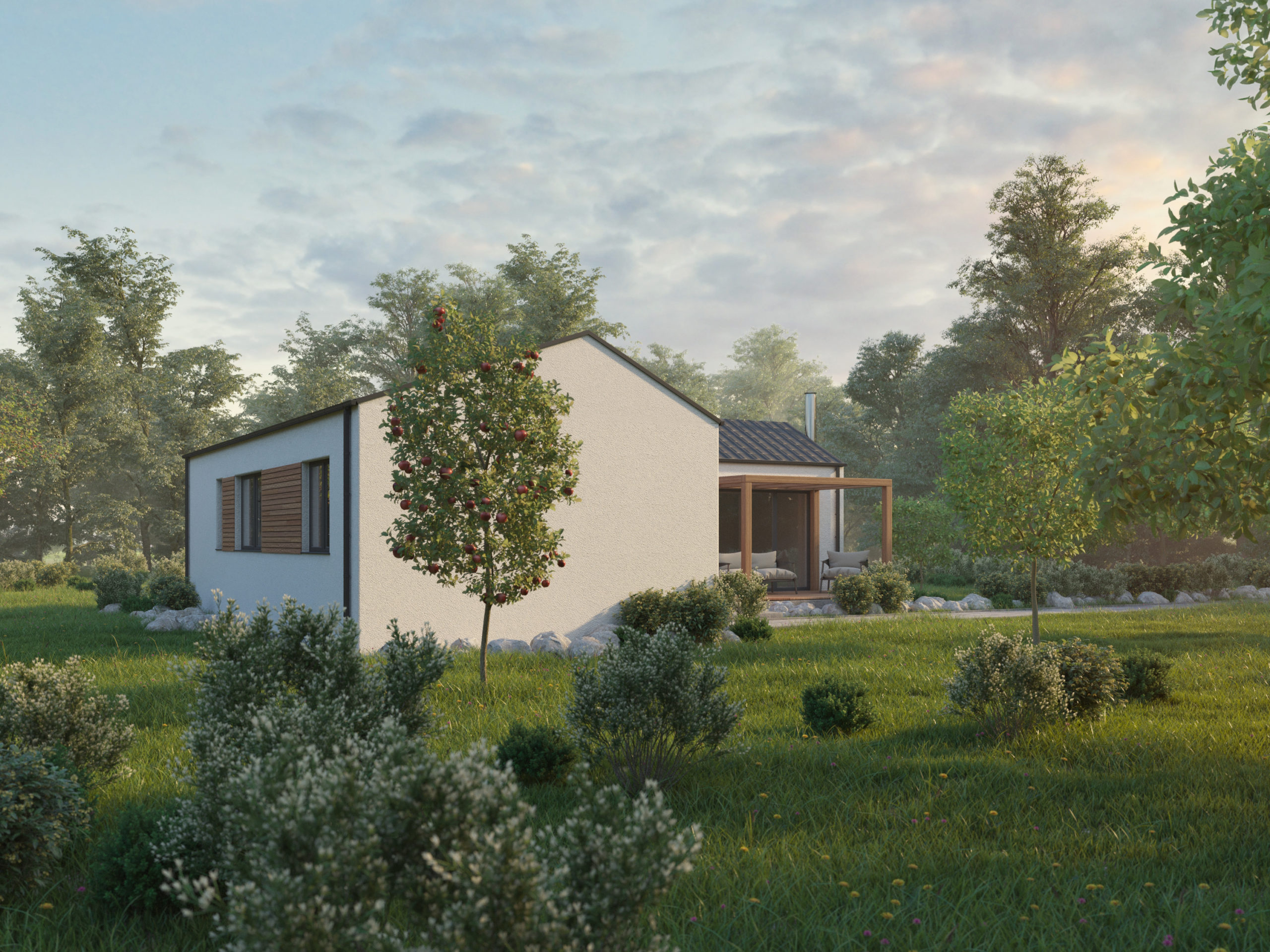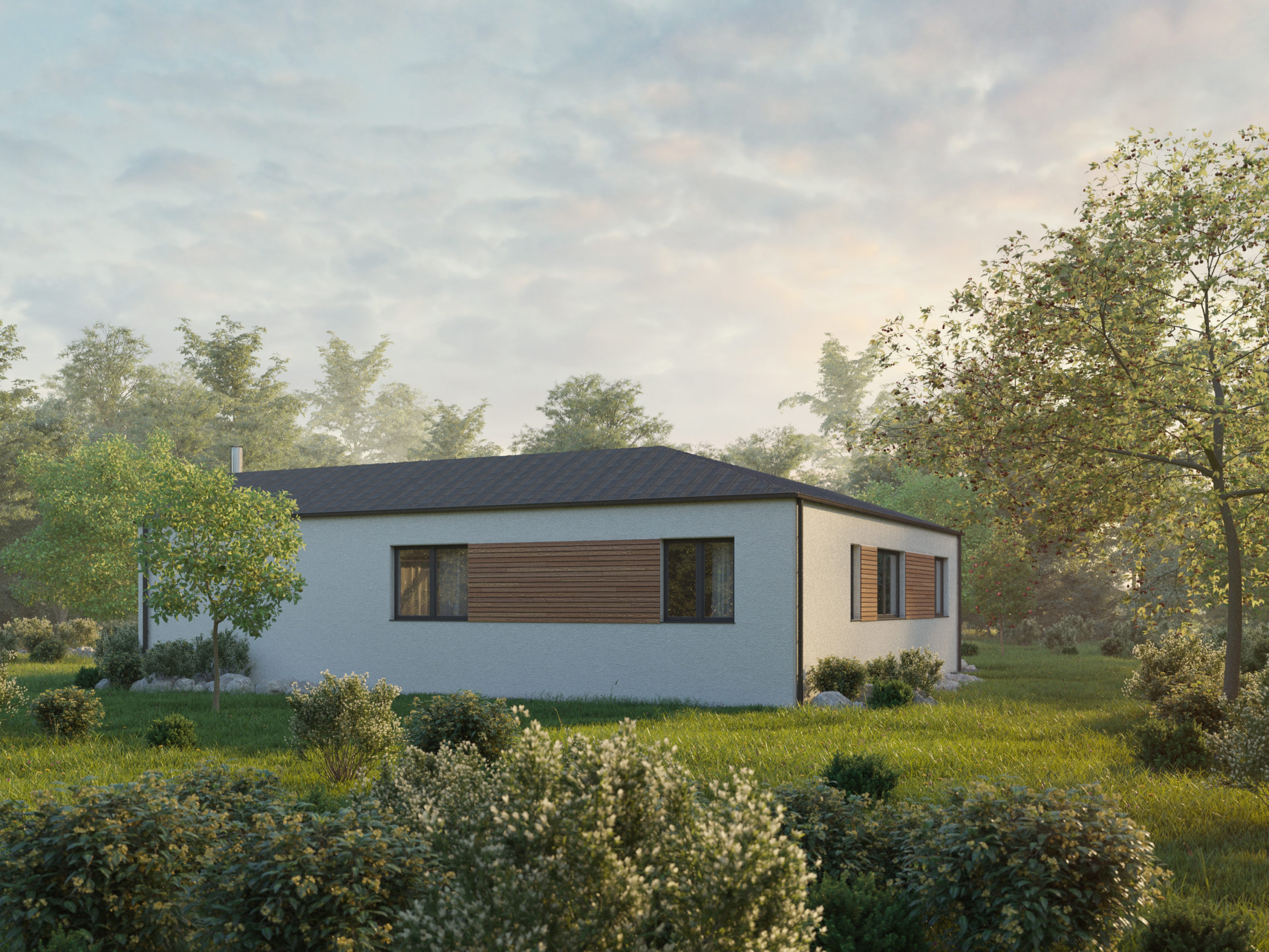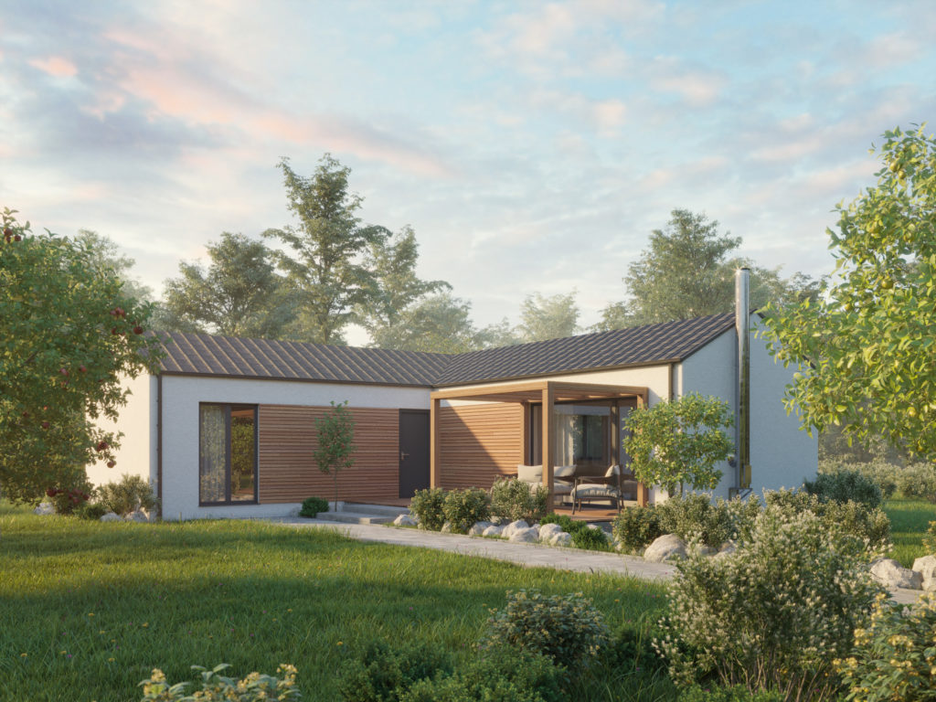 Das Holzhaus Easy 92 in L-Form ist eine geeignete Lösung für jene Kunden, die sich eine mit dem Haus verbundene Garage wünschen. Anstelle der Garage kann diese durch ein vollwertiges Schlafzimmer, Arbeitszimmer oder durch ein Zimmer für andere Verwendung ersetzt werden. Dieses Holzhaus empfehlen wir z.B. für eine Familie mit 3 oder 4 Personen.