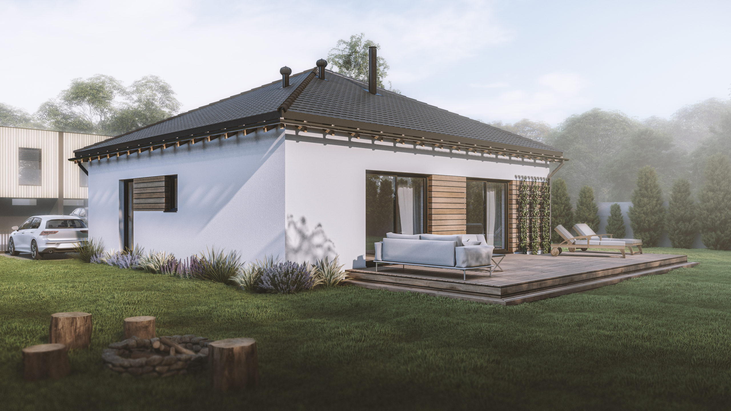 Mit dem Holzhaus Easy 100 reagieren wir auf den Wunsch vieler unserer Kunden einen „klassischen“ Bungalow im Sortiment anbieten zu können. Das Einfamilienhaus Easy 100 bietet mit 2 Schlafzimmern und zusätzlichem Wohnzimmer mit offener Küche genügend Platz für eine kleine Familie oder ein Pärchen und ist mit seinem Grundriss eine preisgünstige Lösung für Ihr modernes neues Zuhause.