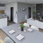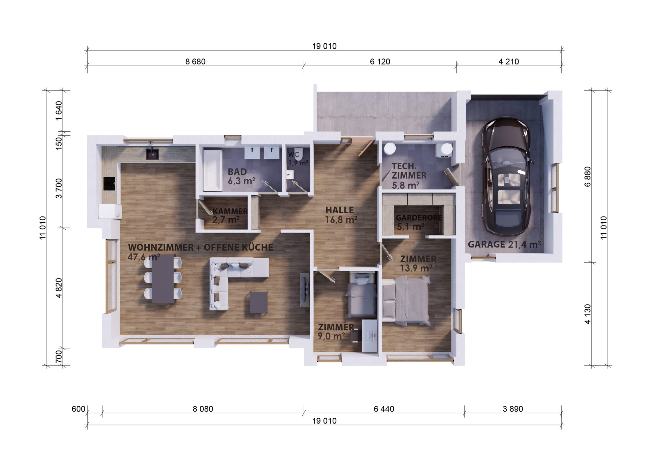 Die zentrale Begehbarkeit über das große Vorzimmer, die große offene Wohnküche mit direktem Terrassenzugang sowie das Schlafzimmer mit begehbarem Schrankraum zeichnen dieses Bungalow Modell aus.