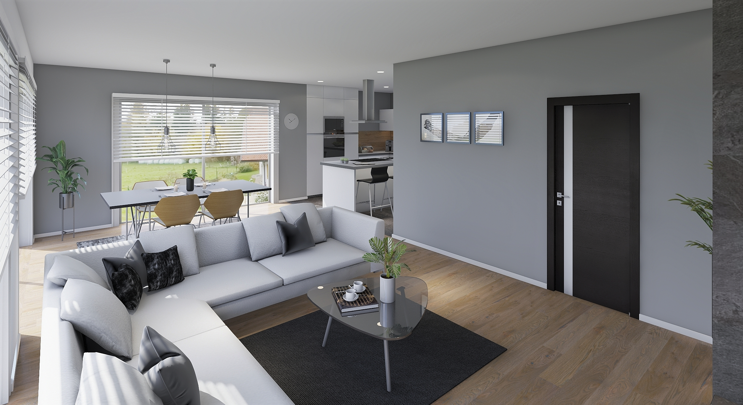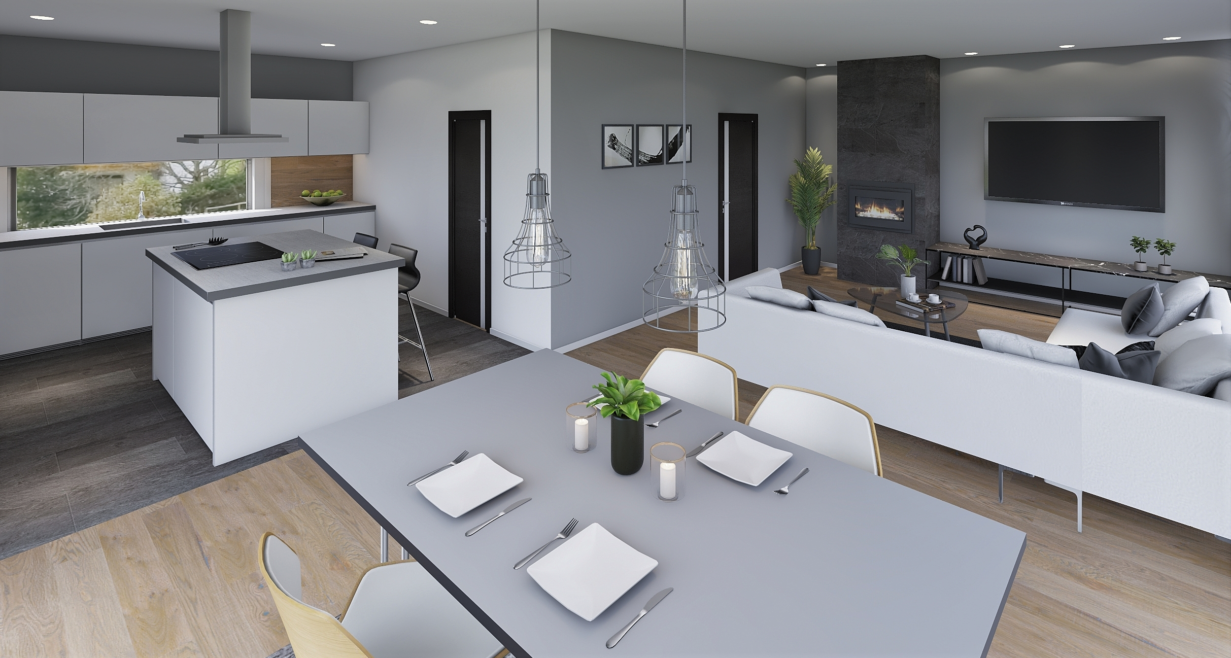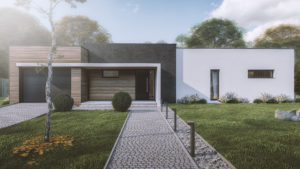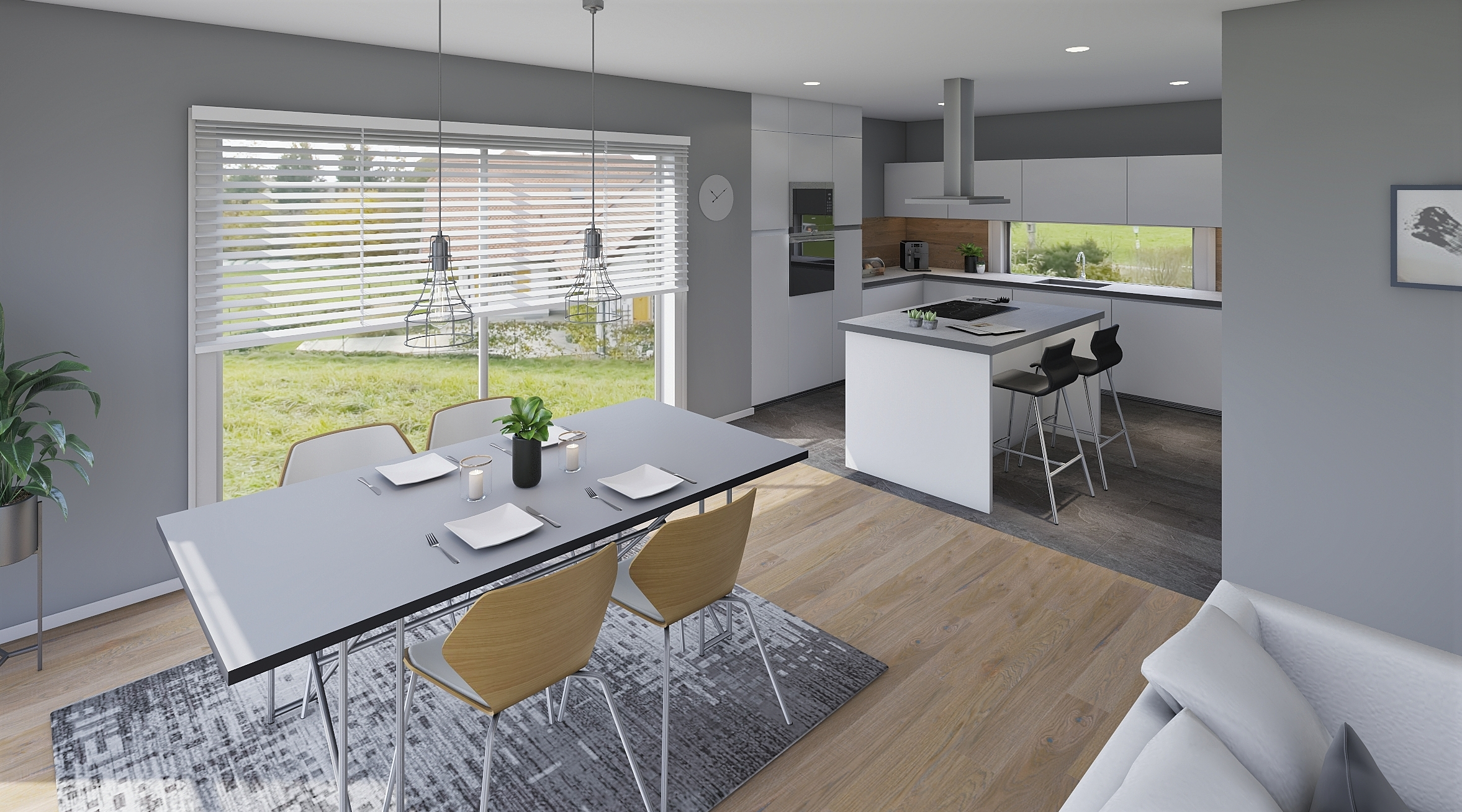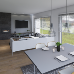 Unser stylischer heller Bungalow Easy 150 mit großen Fensterflächen kann mit 3 Zimmer plus Garage oder mit 4 Zimmer errichtet werden.