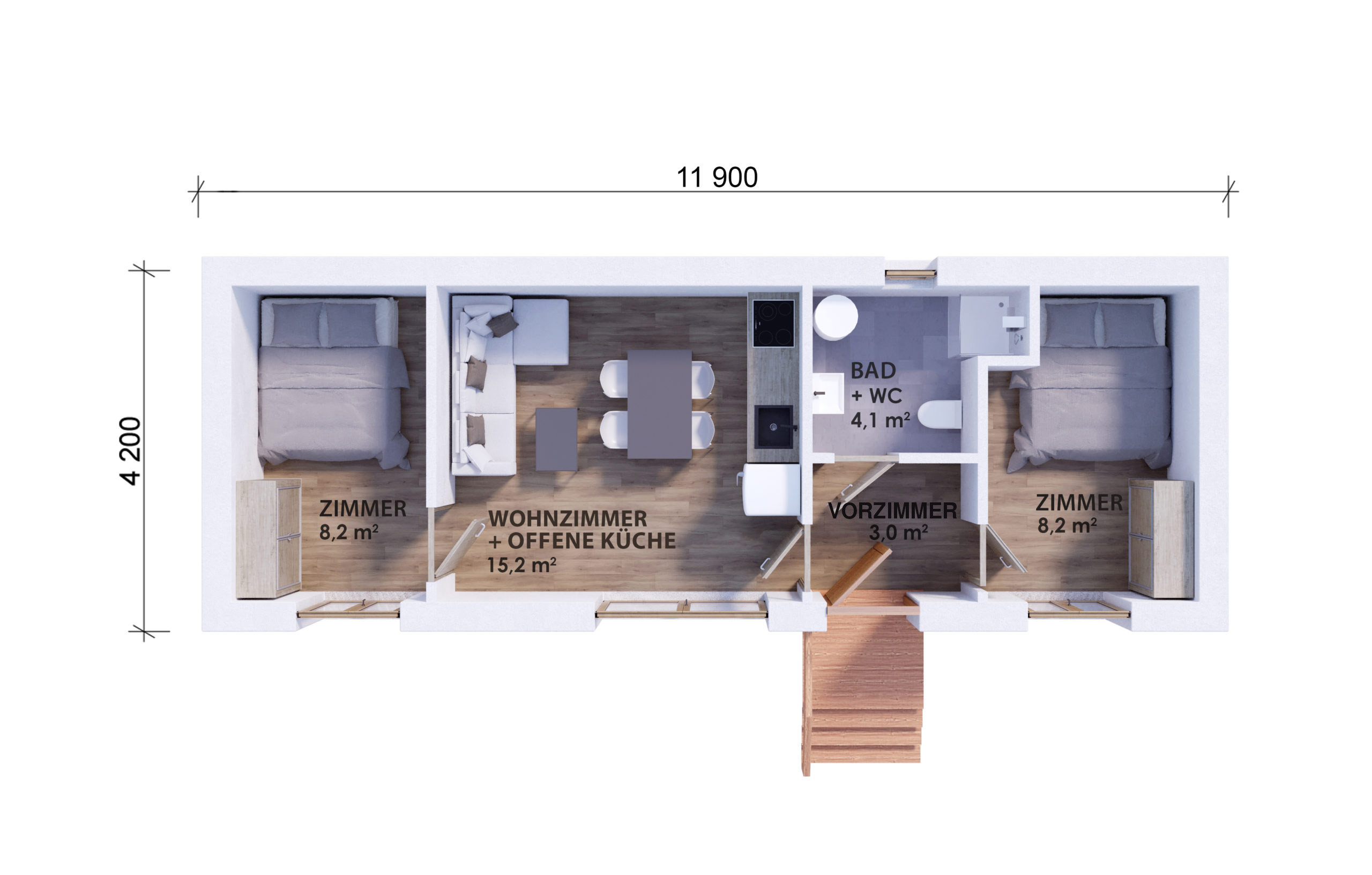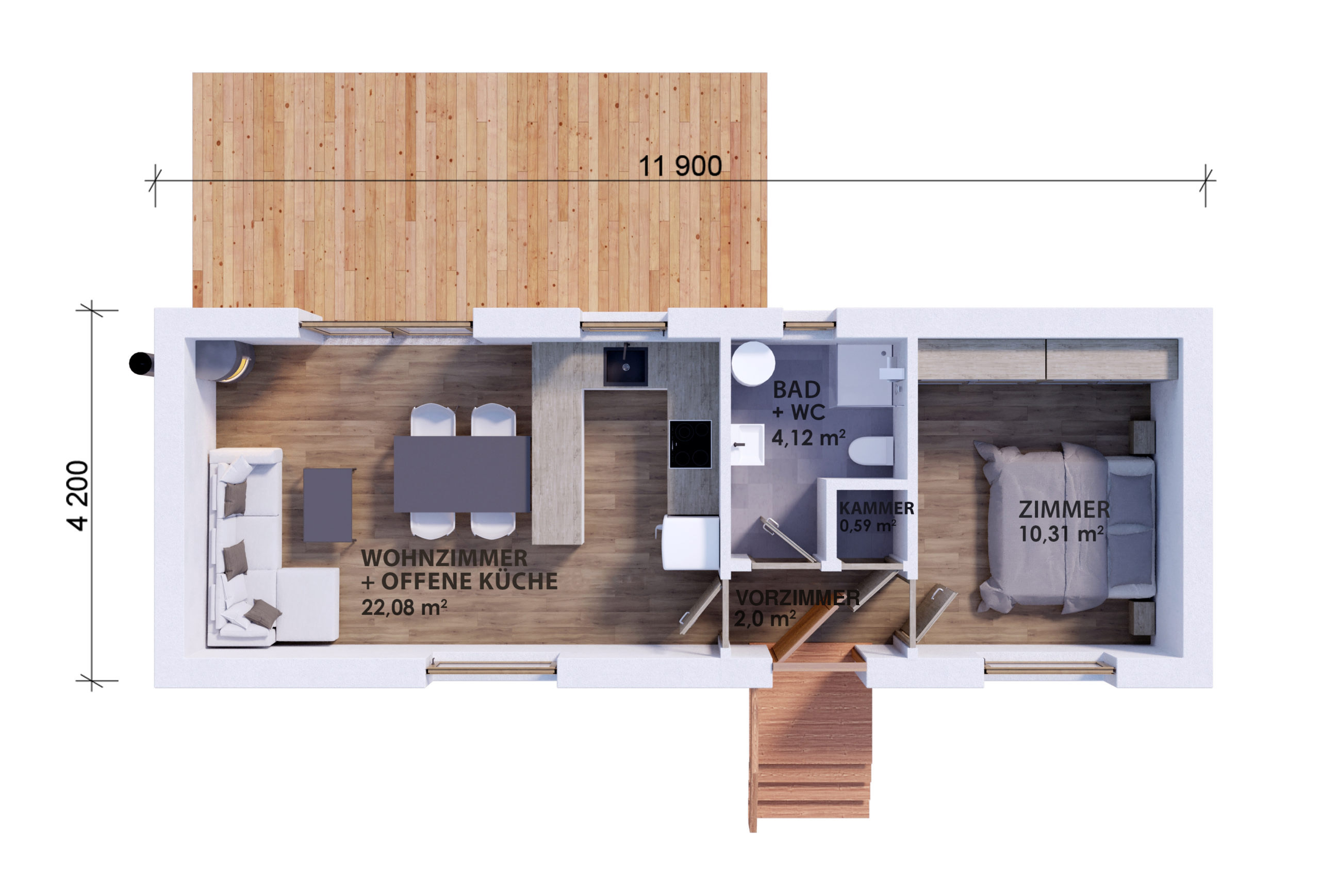 Raumaufteilung: Das Holzhaus verfügt über ein Erdgeschoss mit 2 Zimmer mit offener Wohnküche – Eingangsbereich, Wohnzimmer mit offener Küche, Bad, Zimmer und Schlafzimmer.