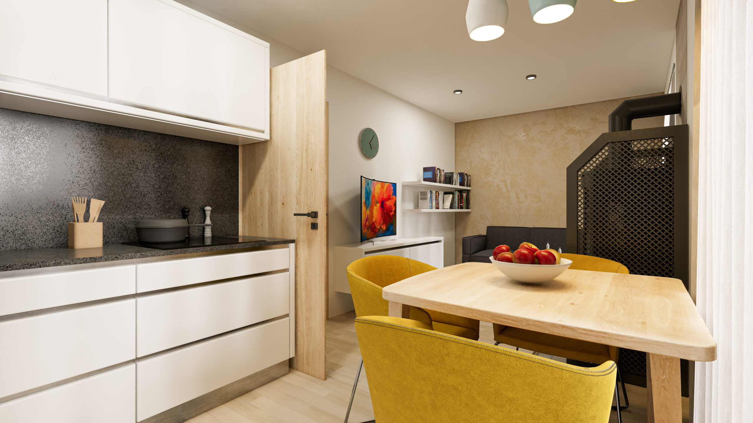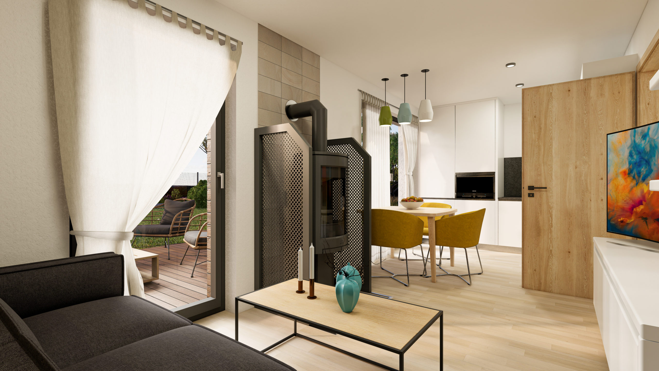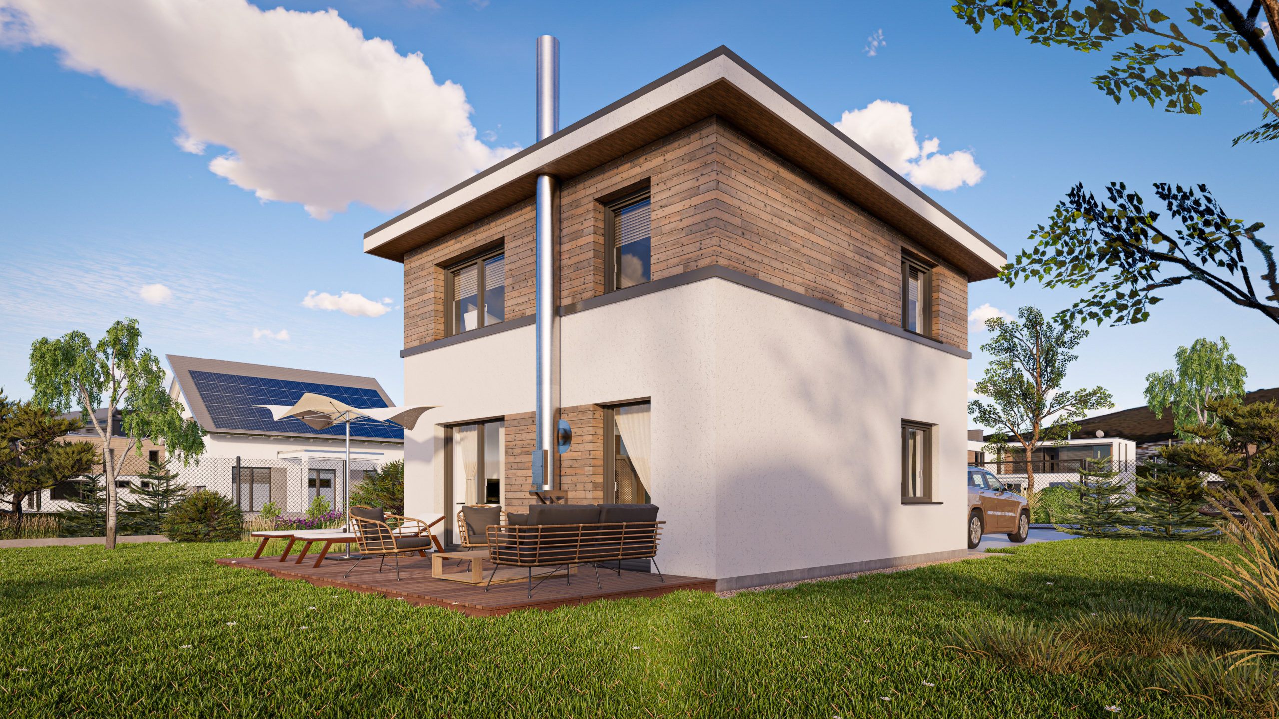 Bei einer Errichtung dieses Modelles in einem Wiener Kleingarten wird kein Kaminofen inkl. Edelstahl-Rauchabzugssystem eingebaut, die Heizung erfolgt mittels einer Warmwasser-Fußbodenheizung in Kombination mit einer Luft-Wasser-Wärmepumpe.