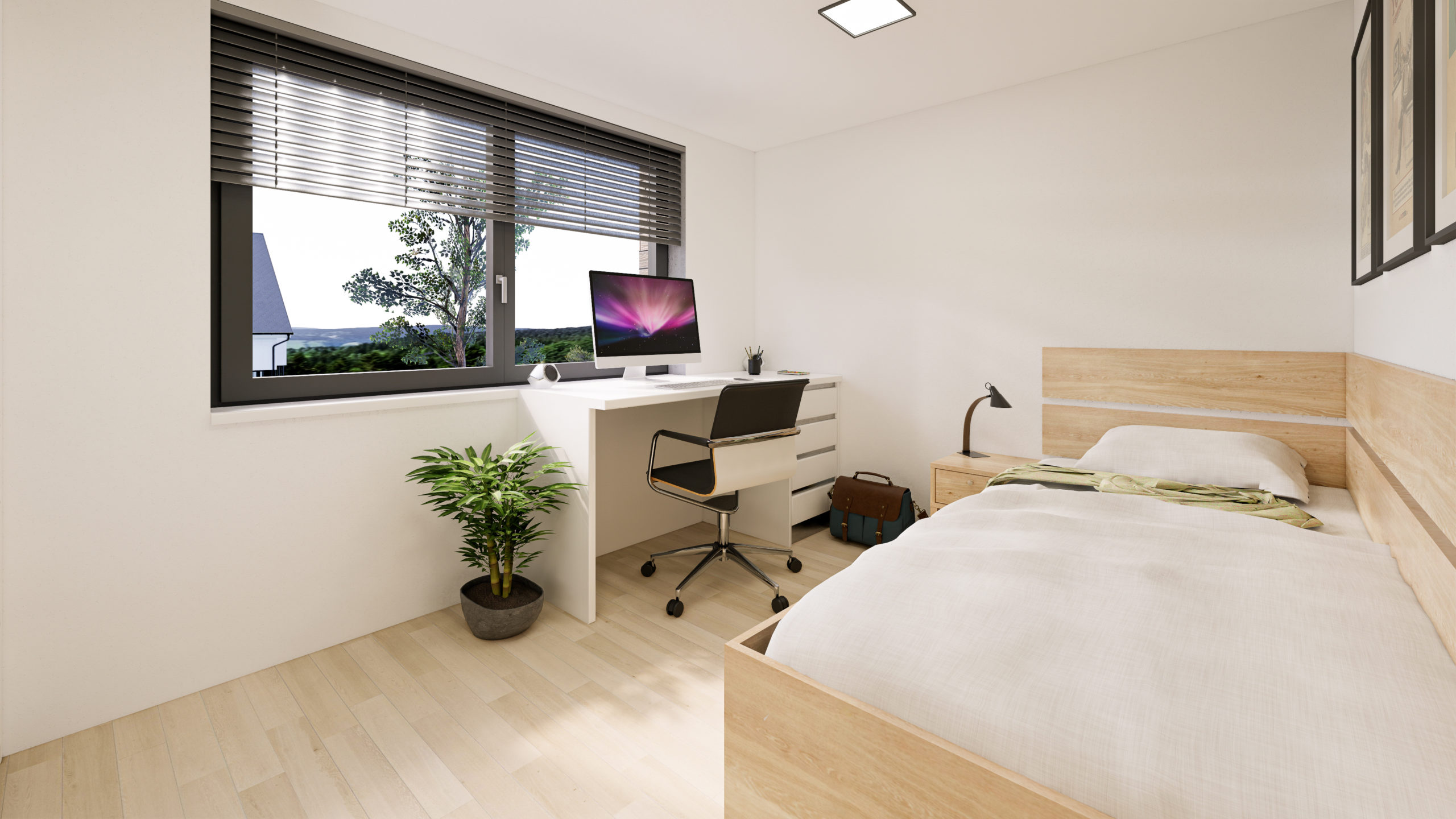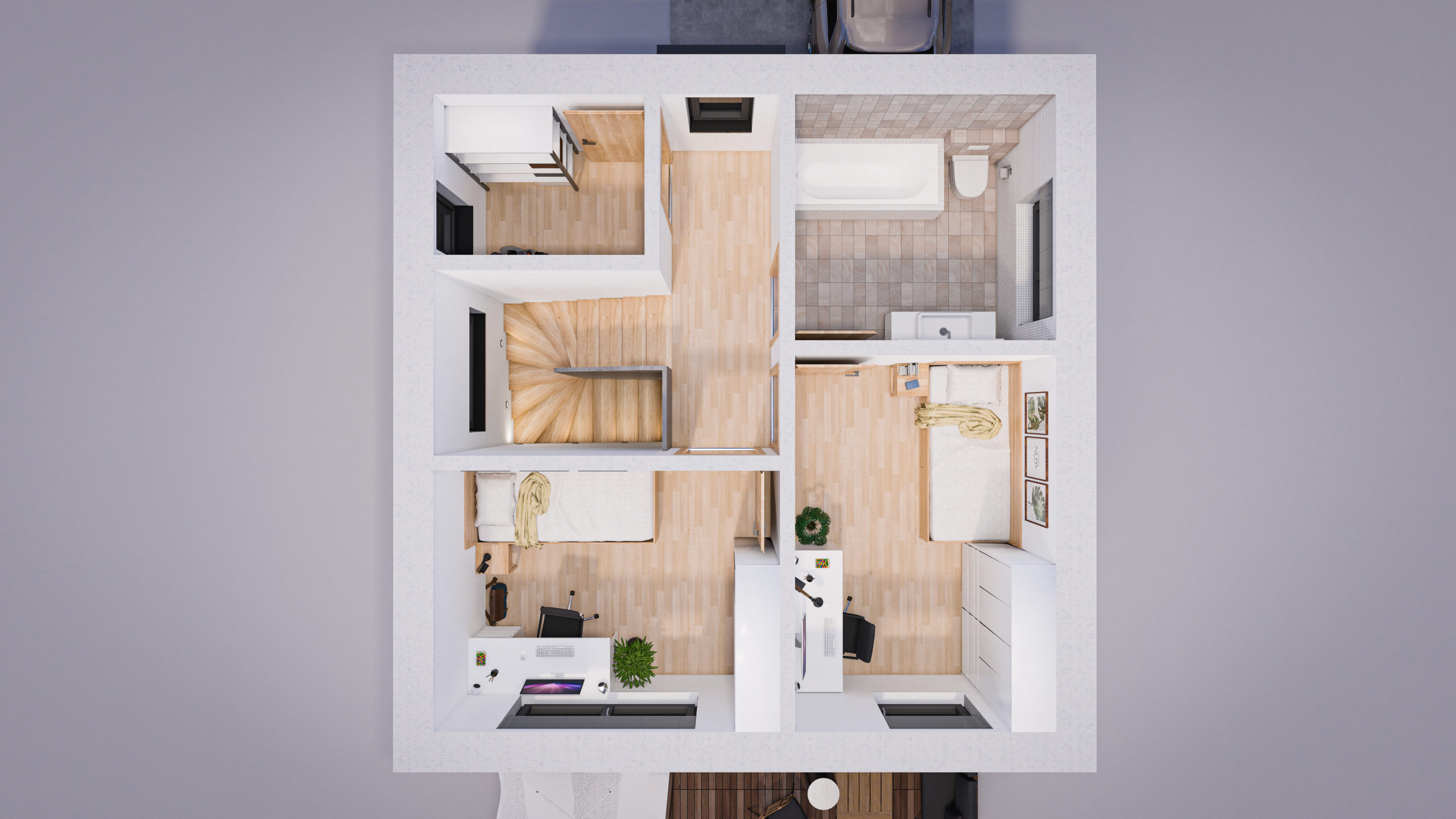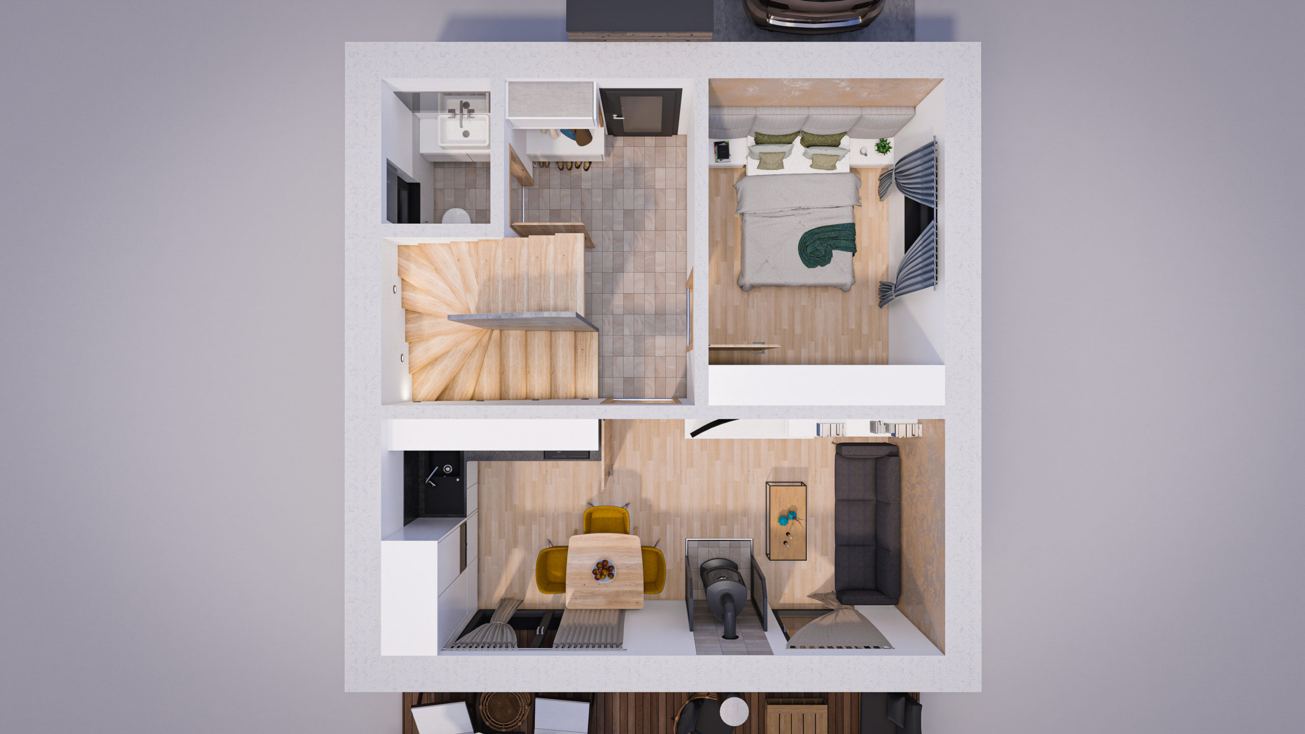 Das zweistöckige Holzhaus ST Easy 50 ist genau nach den Richtlinien des Wiener – Kleingartengesetzes entworfen und bietet mit 3 Zimmern und zusätzlichem Wohnzimmer mit offener Küche genügend Platz für eine Familie mit 3 bis 4 Personen.