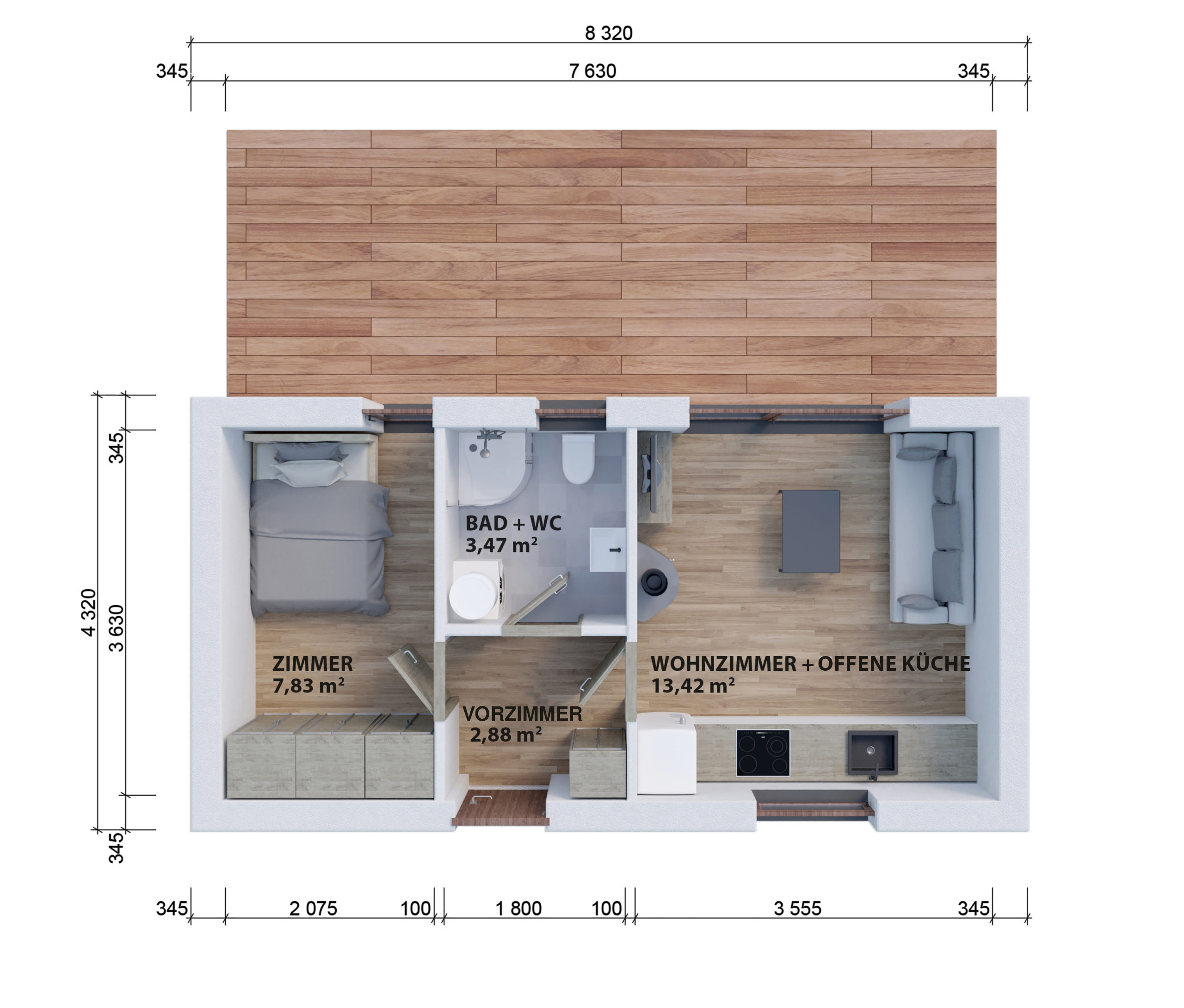 Raumaufteilung: Eingangsbereich, Wohnzimmer mit offener Küche, Bad und Schlafzimmer bzw. Arbeitszimmer.