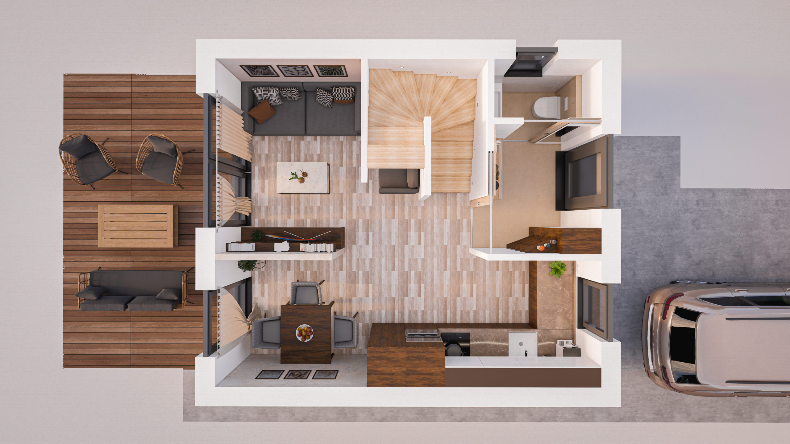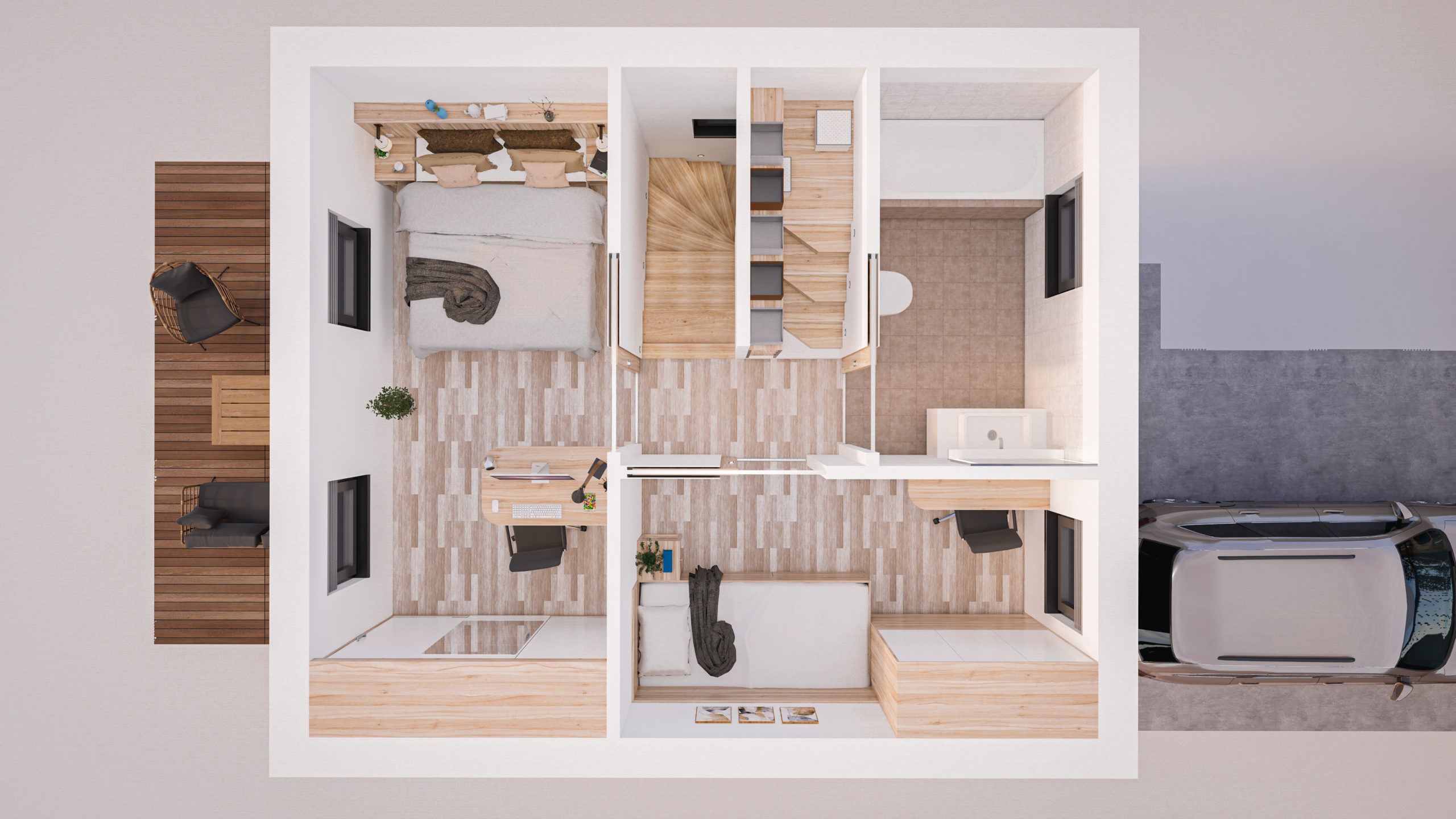 Das zweistöckige Holzhaus ST Easy 37 ist genau nach den Richtlinien des neuen NÖ – Kleingartengesetzes entworfen und bietet mit 2 Zimmern und zusätzlichem Wohnzimmer mit offener Küche genügend Platz für eine Familie mit 3 bis 4 Personen.