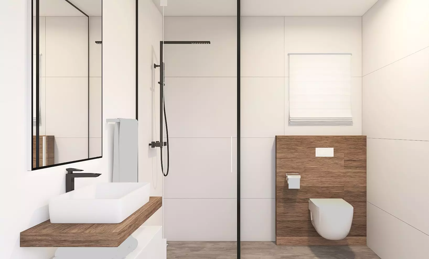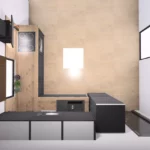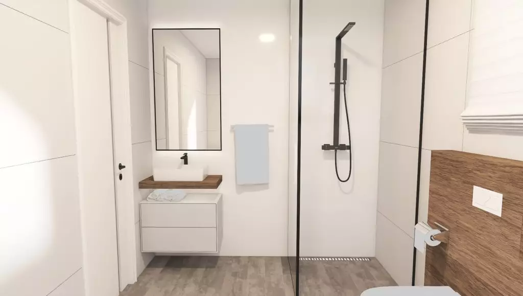 Raumaufteilung: Das Holzhaus bietet 2 Zimmer mit Wohnküche – Eingang, Wohnzimmer mit Küche, Bad und Schlafzimmer.
